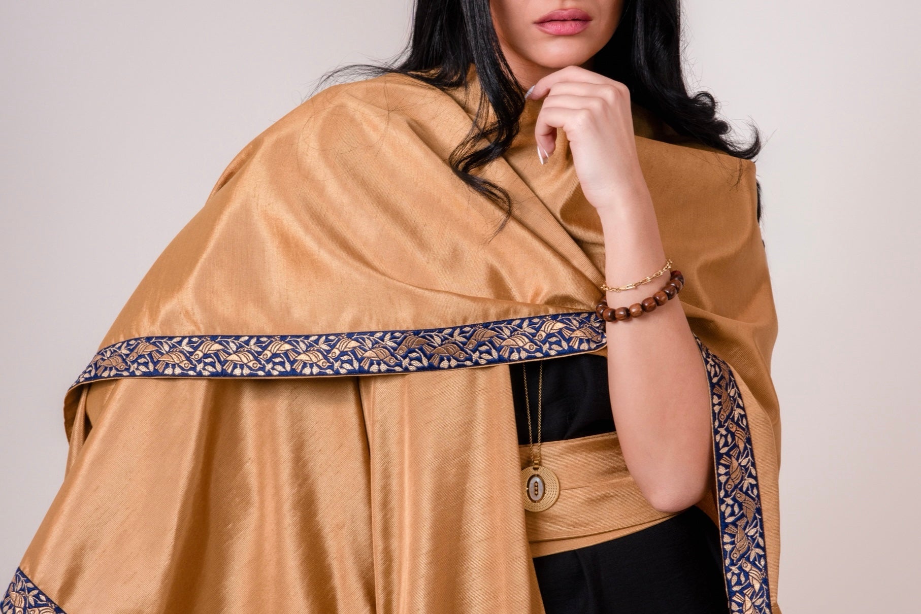 Elevate your wardrobe with this refined coral taffeta shawl, where luxurious fabric meets artisanal craftsmanship. Delicate navy blue and coral embroidery traces the perimeter, creating an elegant border that adds depth and visual interest. The crisp taffeta drapes beautifully, making it an ideal accessory for both formal occasions and sophisticated everyday styling. A timeless piece that combines texture and embellishment for understated elegance.