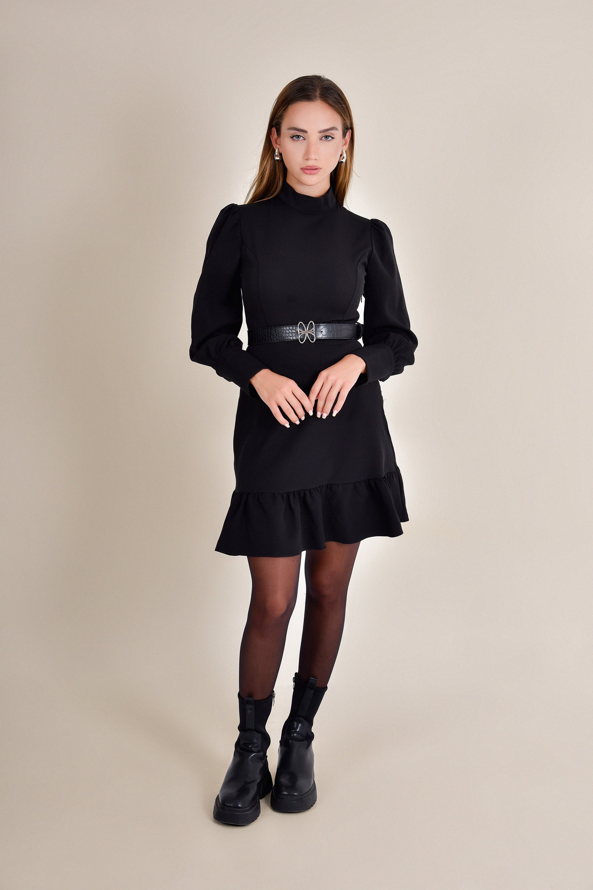 Experience effortless style in our Crepe Dress. Made from crepe fabric, this black dress features voluminous shoulders and puffy sleeves with a fitted cuff for an elegant touch. The waist cut and flared knee length skirt add a flattering silhouette to this must-have dress.