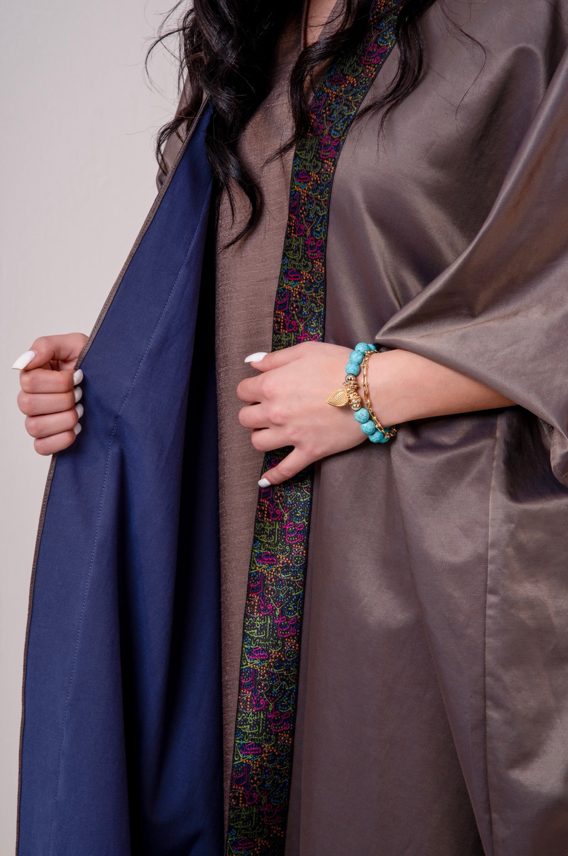 Elevate your modest fashion with this exquisite mocha satin abaya, where timeless elegance meets refined craftsmanship. The luxurious satin exterior drapes beautifully, while a striking blue interior adds an unexpected pop of color when worn. Adorned with intricate satin Arabic calligraphy embroidery along the center front, this piece celebrates cultural artistry and contemporary style. Perfect for special occasions or everyday sophistication, this abaya seamlessly blends tradition with modern sensibility.
